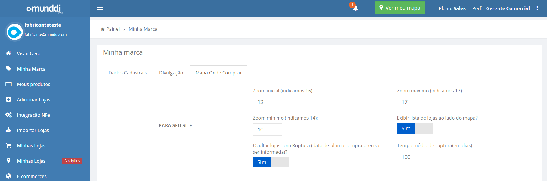 Para personalizar o seu mapa, basta acessar a aba “Minha marca” e clicar em “Mapa Onde Comprar”. Ali, você poderá personalizar o zoom do seu mapa e configurar a ruptura de lojas.